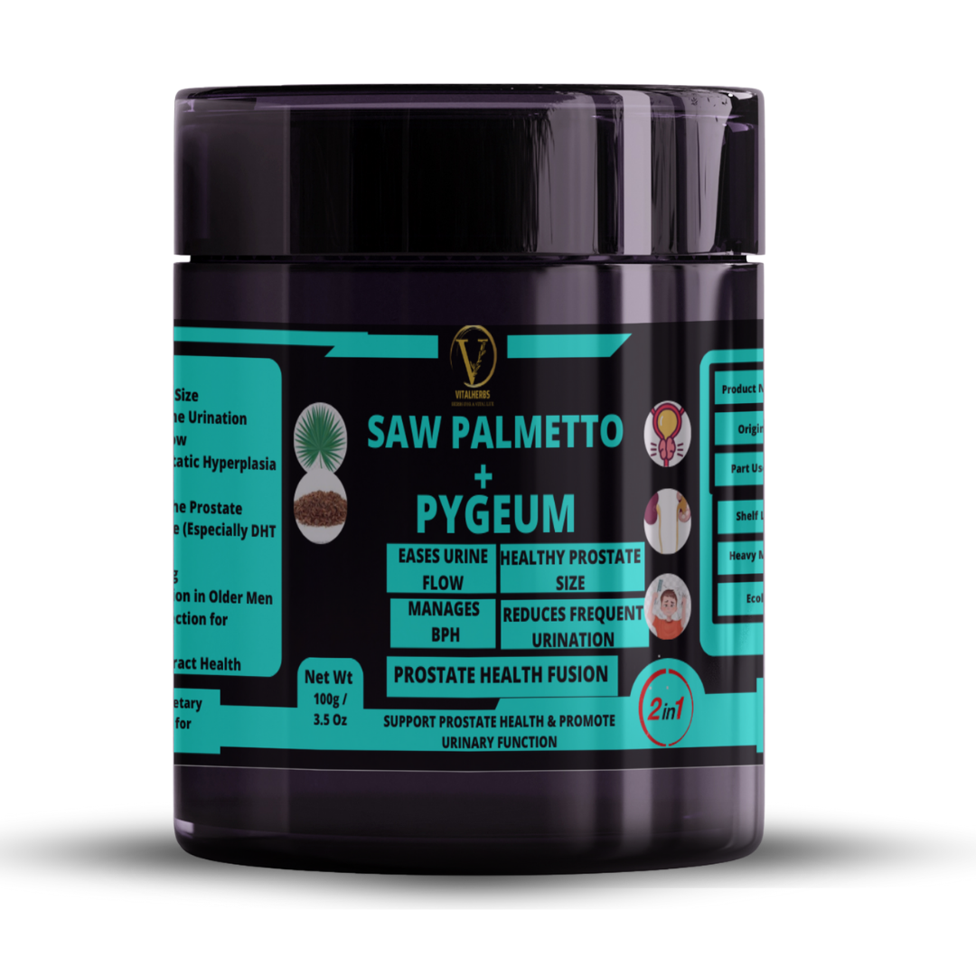 Unlock the natural benefits of Vitalherbs Saw Palmetto Extract with Pygeum Extract Blend, a powerful combination crafted to support prostate health and promote urinary function. This potent herbal blend combines Saw Palmetto, renowned for its ability to manage prostate enlargement, with Pygeum, known for reducing inflammation and supporting better urine flow.